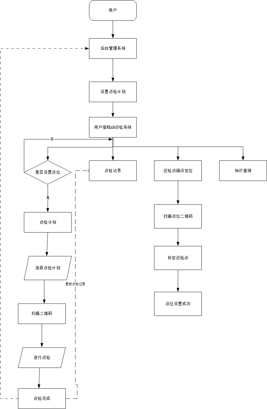 管理人员在后台系统设置点检设备点检计划,日常巡检人员手持移动设备登录系统获取后台录入的点检计划,对每个点检设备的点检仪表进行点检。移动设备在AR场景将仪表数据信息可视化,巡检人员操作可视化信息,后反馈给服务器,完成该设备点检。